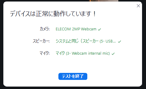 「テストを終了」までいくと、Zoomは自動的に閉じます。