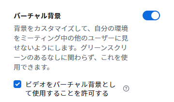 設定がOFFになっている場合は、バーチャル背景を使えません。また、「ビデオをバーチャル背景として使用することを許可する」のチェックが外れていると、動画を背景にできません。